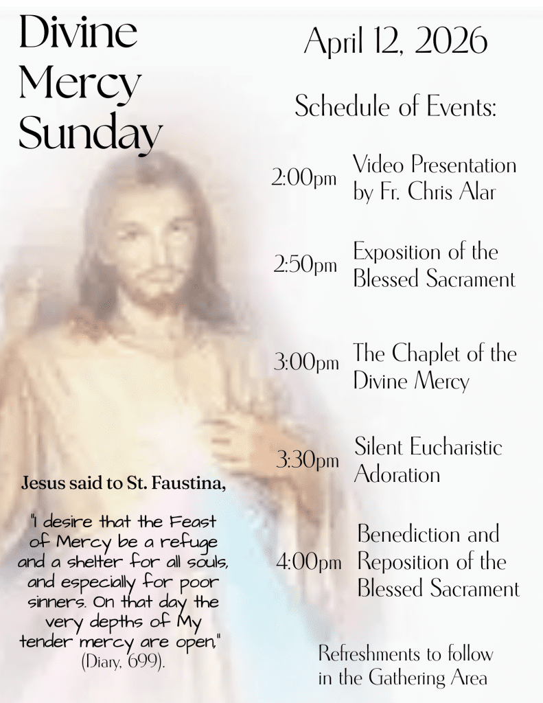 Divine Mercy Sunday – April 12th Please join us to celebrate this beautiful and immensely important feast day!